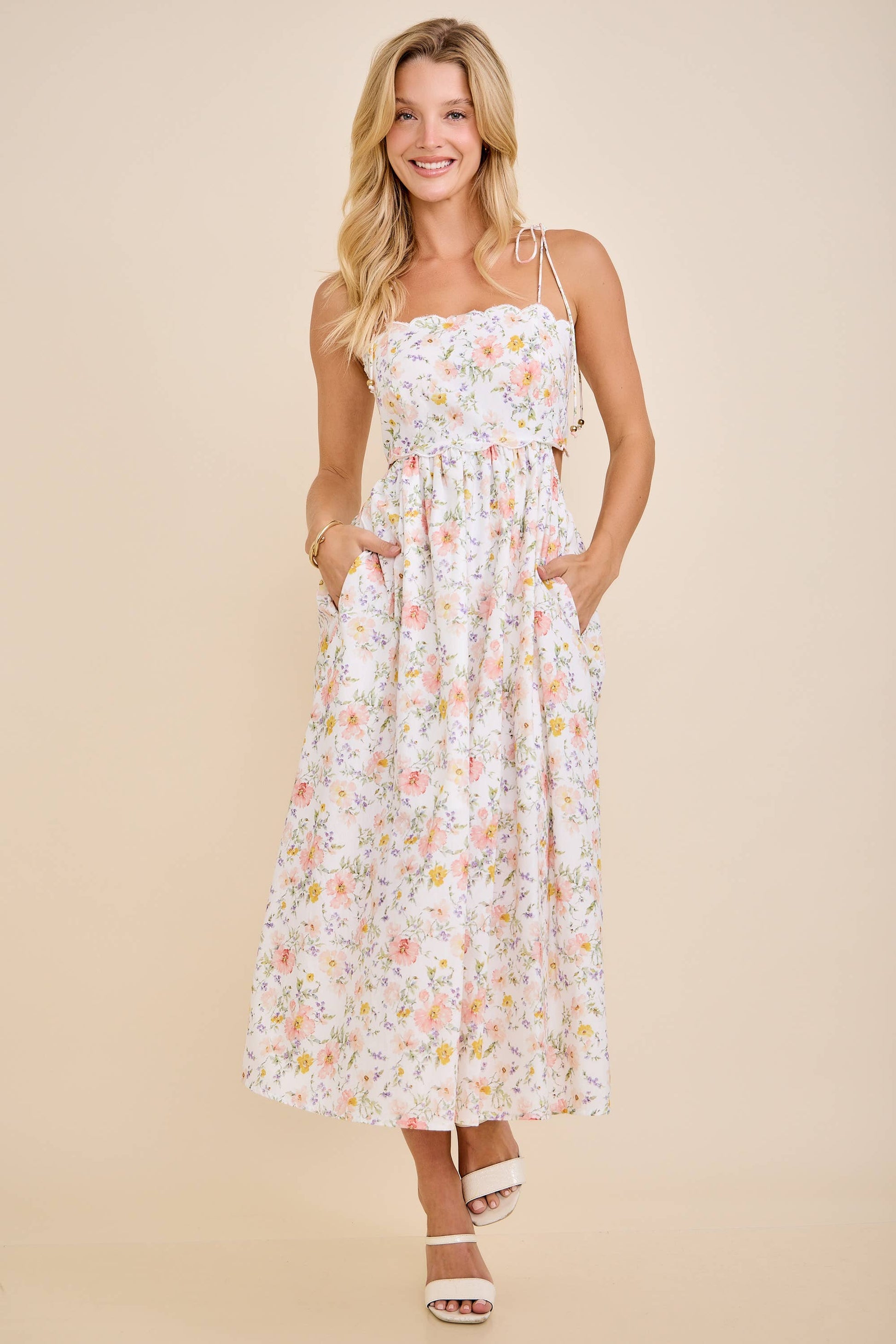 floral midi dress, embroidered scallop dress, tie shoulder dress, sleeveless midi dress, smocked back dress, romantic summer dress, feminine outfit, floral sundress, lightweight vacation dress, garden party style